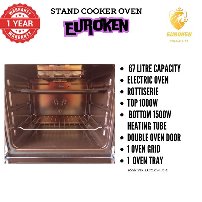 The Euroken 3G+1 (3 Gas + 1 Hot Plate) 65×60 Standing Cooker (EURO65) is a versatile kitchen appliance featuring three gas burners and one electric hotplate, an electric oven, and a durable stainless steel design.