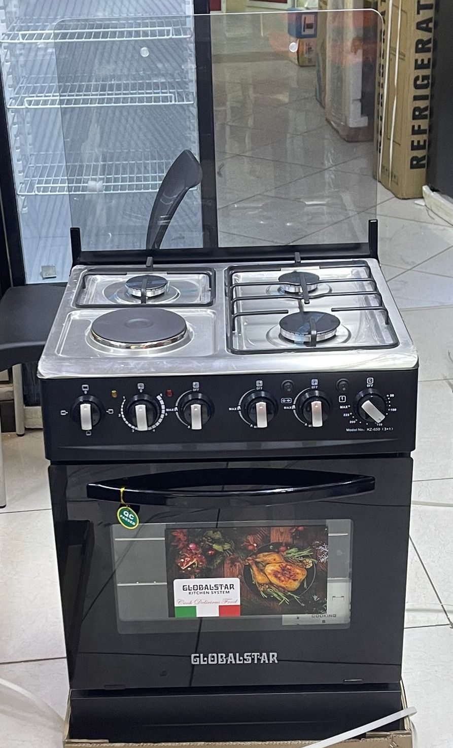 The Globalstar 60×60 cooker is a freestanding, dual-fuel appliance, commonly featuring three gas burners and one electric hot plate, with an electric oven. It is designed to be compact and offers features like auto-ignition and a rotisserie function.