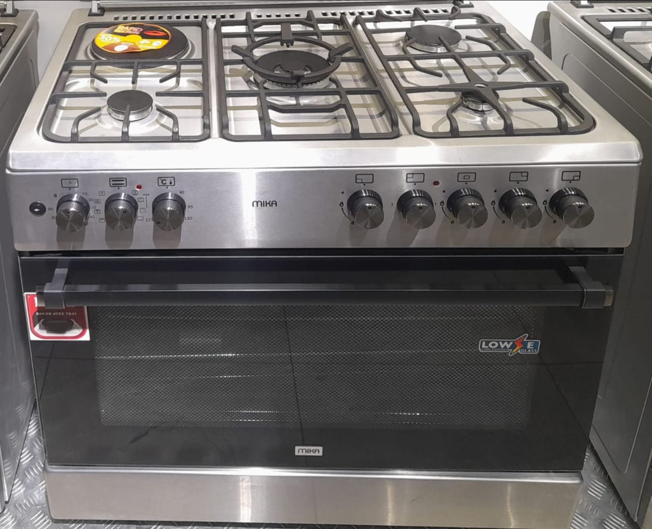 The MIKA MST9041WEF10PB is a 90cm x 60cm dual-fuel standing cooker with four gas burners, one rapid electric hot plate, and a full-size 10-function electric oven. Its platinum grey finish and dual-fuel capability make it a versatile and modern addition to a large kitchen