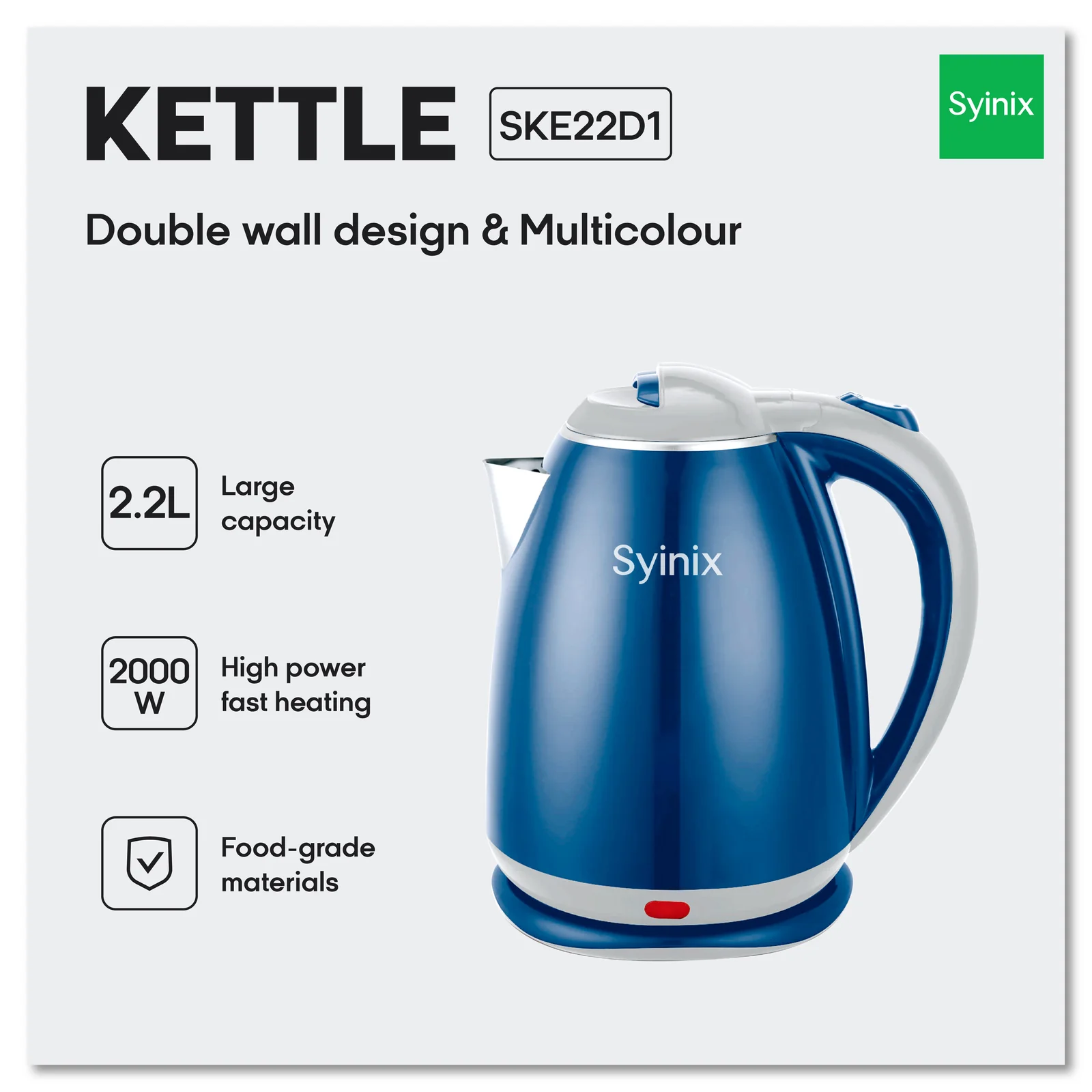 Syinix 2.2 Litres Electric Kettle Food-Grade Materials Multicolour SKE22D1