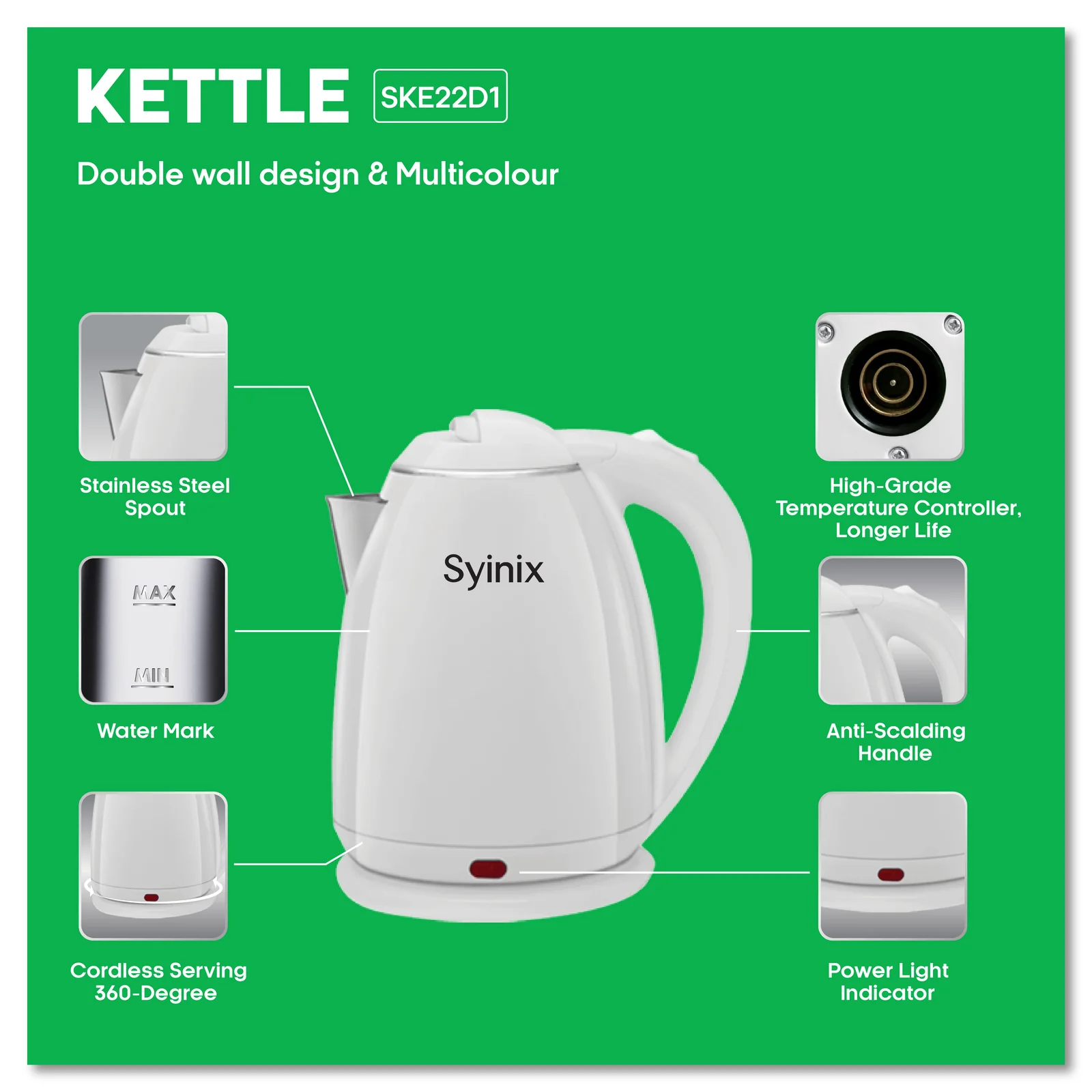The Syinix Kettle Food-Grade Materials Multicolour 2.2L SKE22D1 is a 2000W cordless electric kettle featuring a large capacity, food-grade stainless steel housing, and an outer layer made of top-grade, odor-free PP resin.