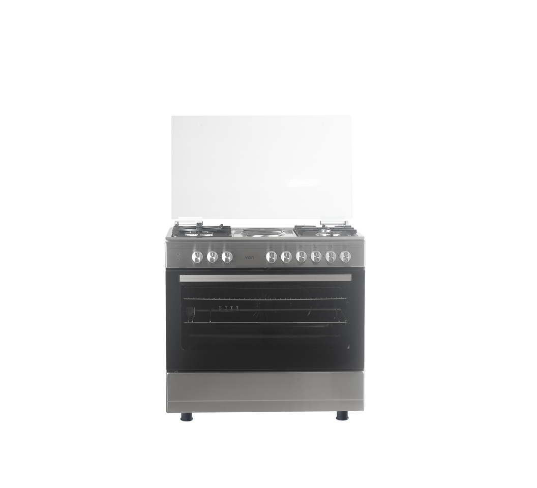 The VON VCF964271FSX Freestanding Cooker is a versatile 90x60cm appliance featuring a combination of gas and electric hobs, an electric oven with multiple functions, and essential safety features like a flame failure device.