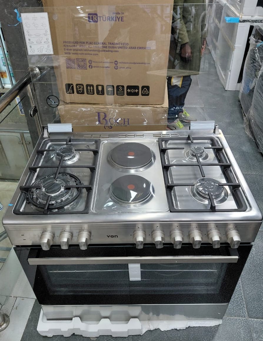 VON VCF964271FSX Freestanding Cooker – 4 Gas + 2 Electric Burners, Cast Iron Pan Support, Flame Failure Device